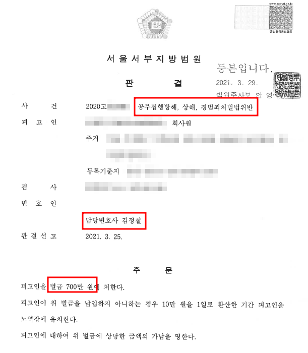서울서부지방법원은 법무법인 재이가 제출한 의견서 및 변론의 내용을 인용하여 벌금 700만원을 선고하였습니다.